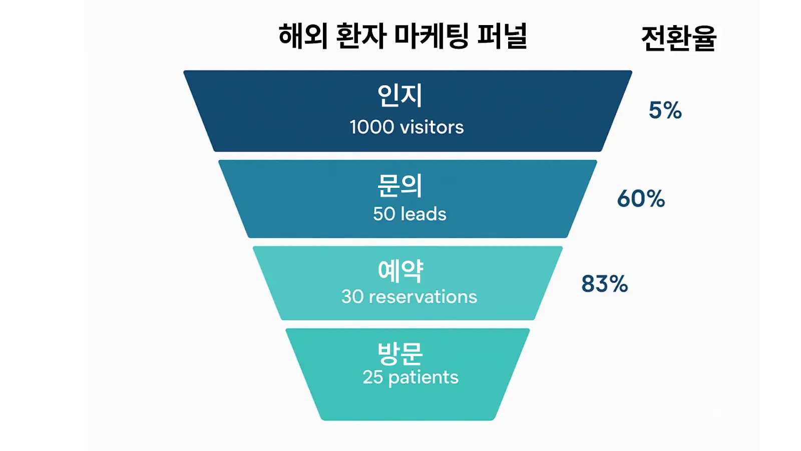 각 단계별 전환율을 추적해야만 어느 지점에서 환자가 이탈하는지 파악하고 개선점을 찾을 수 있습니다. 단순히 "전환율 5%"라고 말하는 것은 아무 의미가 없습니다.