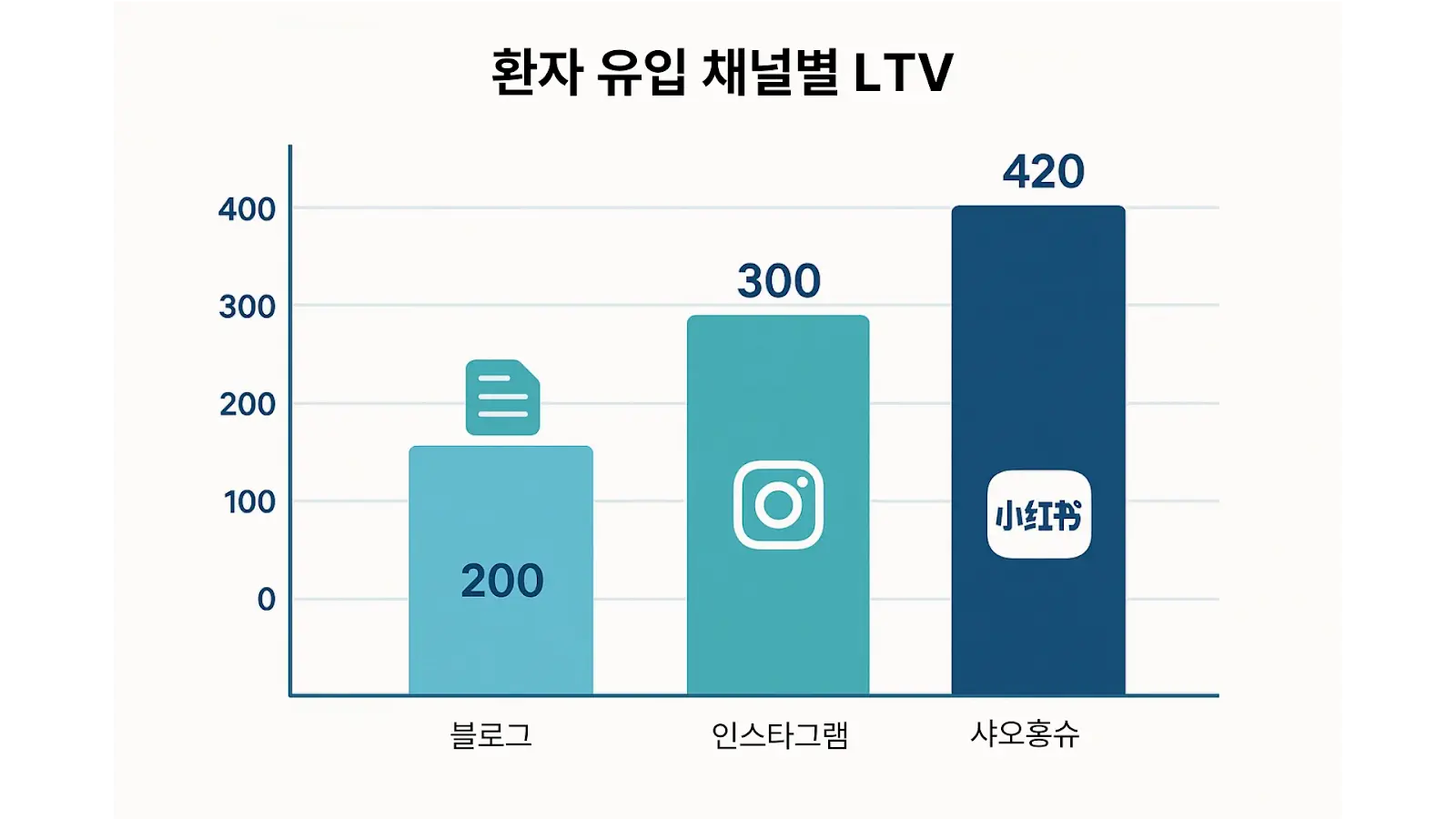 샤오홍슈 환자: 평균 LTV 420만 원 (신뢰도 높은 후기 기반, 재방문 및 지인 추천 활발)